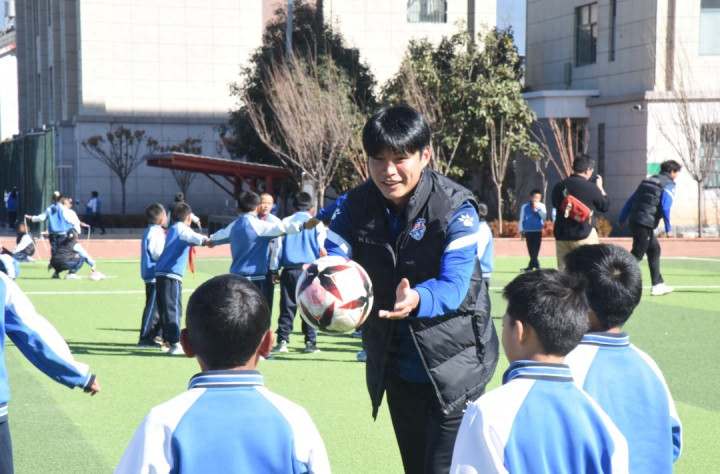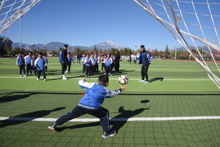 1月13日,滇超联赛丽江队走进玉龙县文笔学校开展“足球筑梦,良善同业”公益行动。(丽江融媒记者 和玉松 摄)