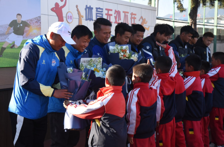 1月13日,滇超联赛丽江队走进丽江市实验学校开展“足球筑梦,良善同业”公益行动,孩子们给球队队员奉上鲜花和祝贺。(丽江融媒记者 和玉松 摄)